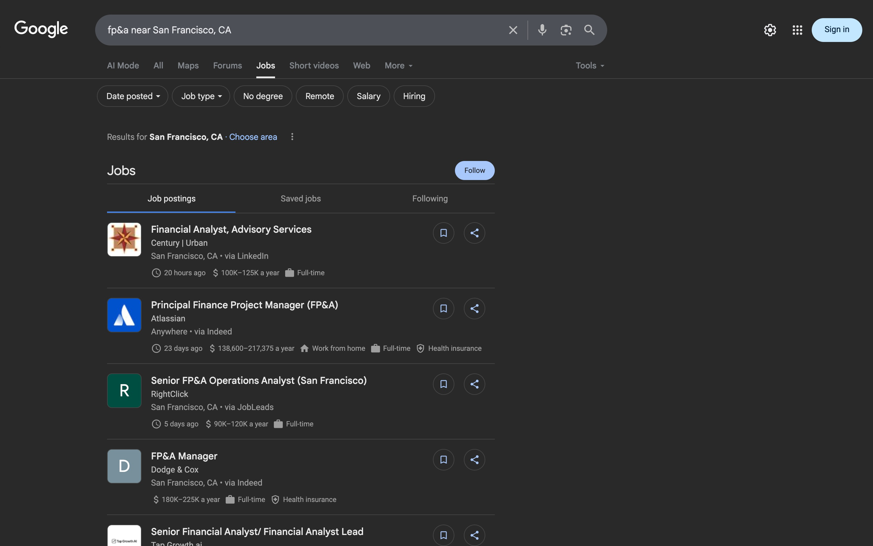 2. Go on Google, search for “(role) near (place),” and click “Follow” (here’s an example for FP&A Analyst jobs in San Francisco) so you are similarly alerted to relevant new postings.